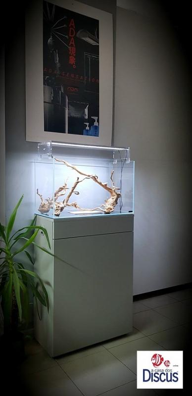 Aquário em vidro extra claro 60X30X36 tipo 60P e móvel cor Cinza modelo “A Casa dos Discus” 60X32x80 produzido por medida e com possibilidade de fabrico em várias cores.