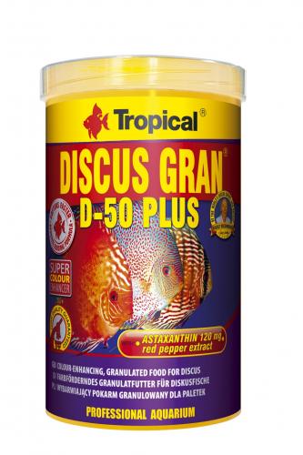 TROPICAL DISCUS GRAN D-50 PLUS é um alimento promotor da cor, em forma de granulado que se afunda lentamente, com elevado teor de proteína (50%) para discus jovens e adultos e outras espécies de peixes exigentes. A proteína, rica em aminoácidos essenciais, promove um crescimento e desenvolvimento saudável e o elevado teor de astaxantina promove a coloração. A adição de zeólito influencia positivamente o sistema digestivo e a eliminação de toxinas do organismo dos peixes. O beta-glucan ajuda o sistema imunitário no combate a agentes patogénicos. A utilização regular deste alimento promove um crescimento e desenvolvimento saudável, uma intensificação da cor, melhorando o sistema imunitário e incentivando a desova. ALIMENTAÇÃO: várias vezes ao dia, em pequenas quantidades.